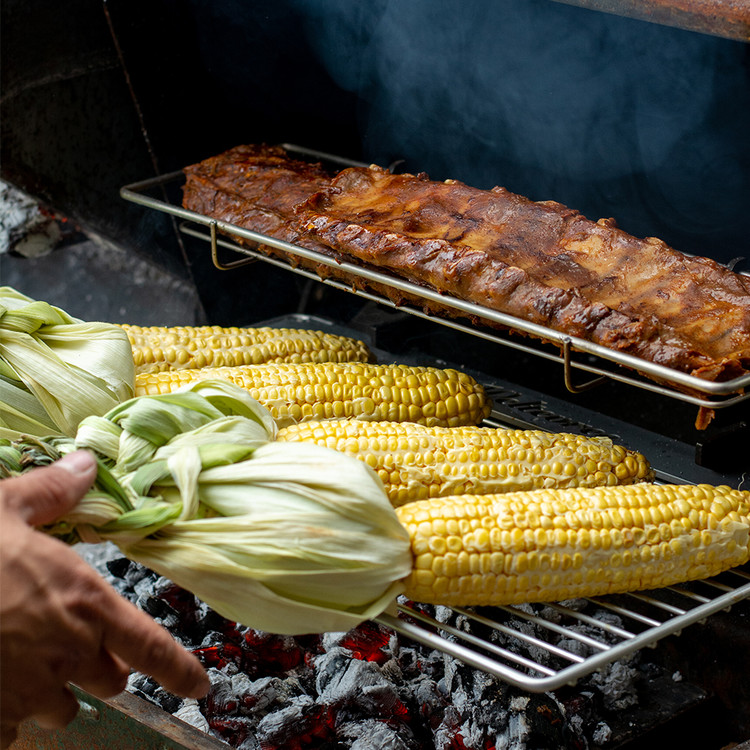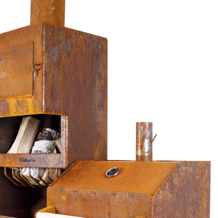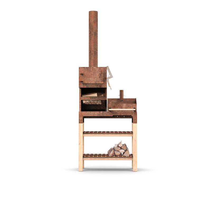 이 장작 오븐에는 대형 요리 화격자, 잠글 수 있는 문이 있는 피자 스톤, 고기, 생선 또는 야채를 훈제하고 요리할 수 있는 뚜껑이 있습니다.