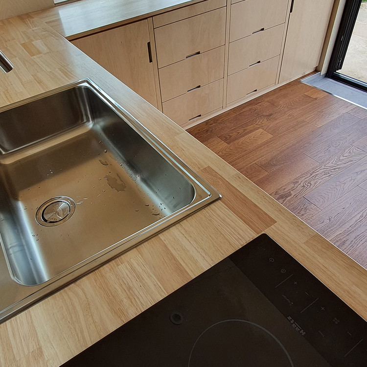 ㄱ자형 싱크대는 거실 공간과 나란히 놓여 짧은 동선을 만들고,