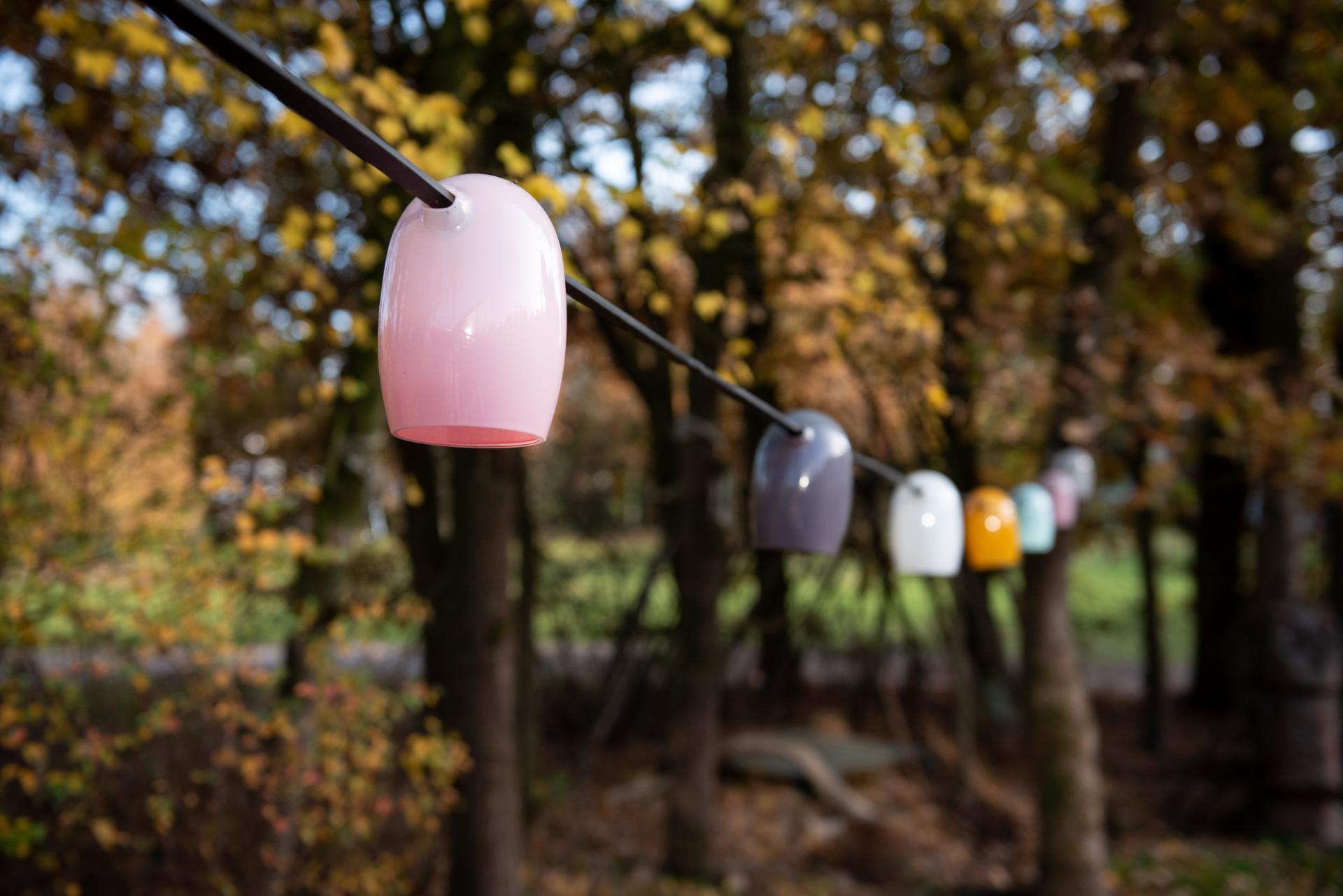 손으로 불어서 만든 유리 전등갓의 스트링 조명 은 실내외에 경쾌한 조명 분위기를 연출합니다. 유리 전등갓은 얼룩이 지고 코팅되어 있어 일년 내내 야외에 둘 수 있습니다.